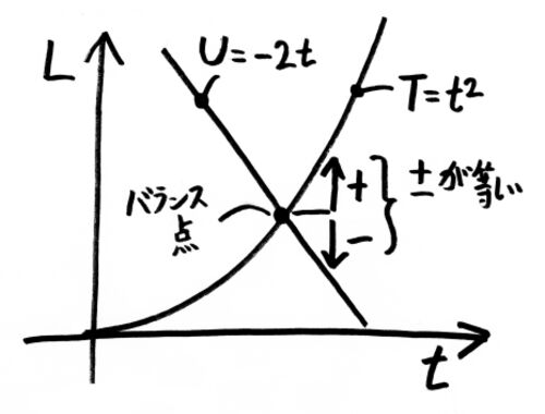 ラグランジュ方程式とは、解析力学を初めとする物理学の基礎を成す方程式です。 ∂L( q(t), q'(t), t )/∂q(t) - d/dt{∂L( q(t), q'(t), t ) /∂q'(t) } = 0 -- wikipedia:オイラー=ラグランジュ方程式 ちょうど関数の最小値を求めたいとき「微分=0」を調べ…